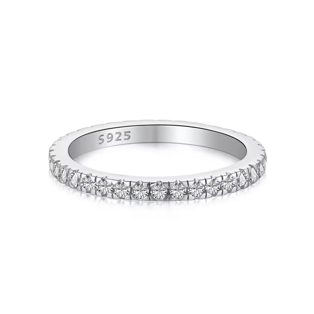 A stacking essential that sparkles in every light. The Ariana Ring is a timeless pavé band ring crafted in high-quality 925 Sterling Silver, available in your choice of sleek rhodium plating or rich 18K gold plating. Its slim, lightweight design makes it the perfect stacking ring, whether paired with statement pieces like the Mini Kira Ring or worn solo for effortless elegance.