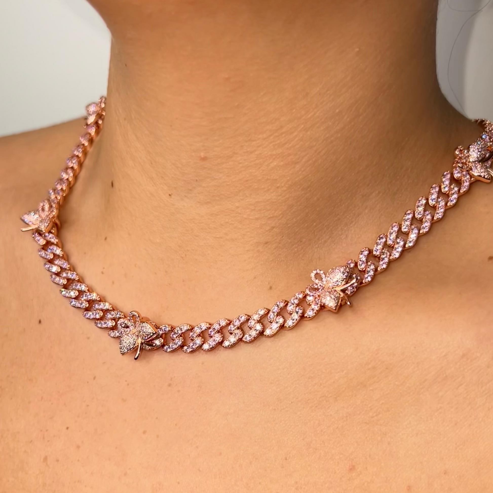Our Mini Butterfly Cuban Necklace, is a stylish and unique accessory for any occasion. This stunning necklace features 5 butterfly charms, each beautifully encrusted with clear cubic zirconia stones for an iced out look. The necklace is available in 18K Gold Plated or Platinum Plated finishes, adding a touch of luxury to your outfit. With a width of 9mm, this piece is perfect for layering with other necklaces or wearing on its own. Make a statement with our Mini Butterfly Cuban Necklace today.